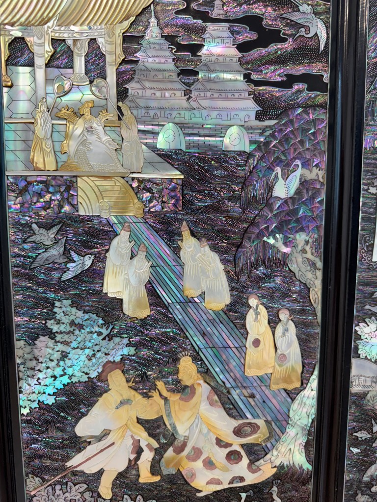 The art of najeonchilgi includes four cutting techniques (most of which were too difficult to learn in the day class I took). These techniques are: cut-out, thin-strips, engraving, and notching. The cut-out technique is used to create characters such as are shown in the picture above on the box in the middle of the floor in the top right. In the picture below, the road and much of the ‘background” used the thin-strips technique. The Notching technique can most easily be seen on the pieces of yellowish mother of pearl, especially to add detail to the human figures. The birds in the same picture are the best example of the notching technique.