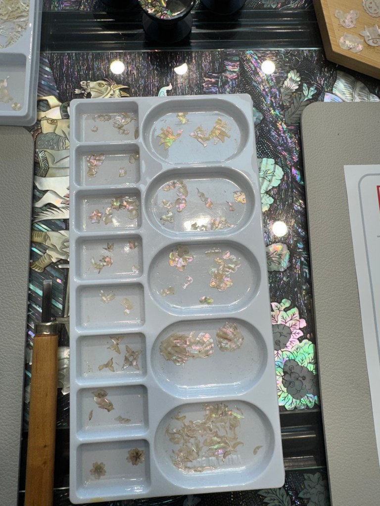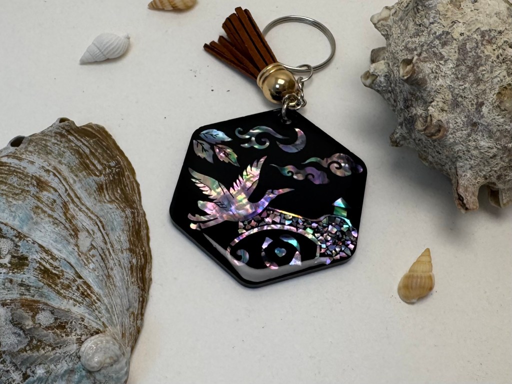 While in Korea, I had the opportunity to experience designing and putting together my own najeonchilgi on a keychain at Hwiho Crafts through the travel experience app klook. There were lots of options for me to choose from, such as a traditional hair stick called binyeo, a compact mirror, a trinket box, pop socket, brooch, or miniature traditional table called soban. Some of the options I had for the mother of pearl that had been prepared included animal shapes to match your Chinese zodiac sign, thin strips to form your own geometric design, and traditional motifs such as cranes, moons, turtles, flowers, pine trees, and swirling clouds.